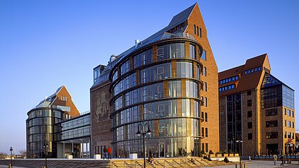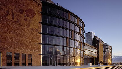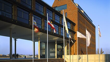 Neubau auf der komplett restaurierten Silohalbinsel im Stadthafen Rostocks eine faszinierende Verschmelzung von historischem Charme und ausdrucksstarker Moderne. Die lange Tradition der Seefahrt und des Klinkerbaus in der Hansestadt wurde aufgegriffen und hochwertig, aber unprätentiös im Businesscenter komponiert. Zwei alte, künstlerische Intarsienwände blieben erhalten und bilden nun das Herzstück des ca. 350 Arbeitsplätze bietenden, mit über 100.000 rt-blau-violetten Klinkern gestalteten Bürogebäudes.